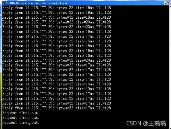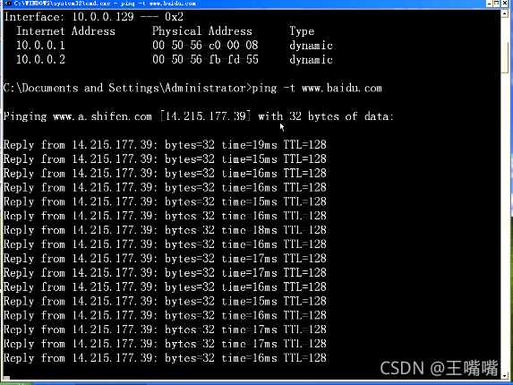 Windows虚拟机中测试与百度之间的通信,-t是持续的意思。ping -t www.baidu.com