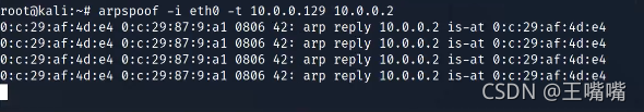 arp攻击通用格式 arpspoof -i eth0 -t 10.0.0.129 10.0.0.2