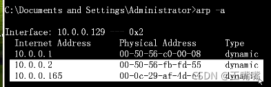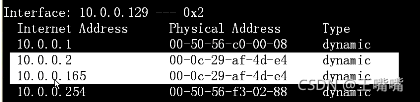 我们发现10.0.0.2和10.0.0.165的MAC地址是一样的。之前提到过,MAC地址的特点:具有唯一性。就是因为被欺骗了,才会导致MAC地址一样。