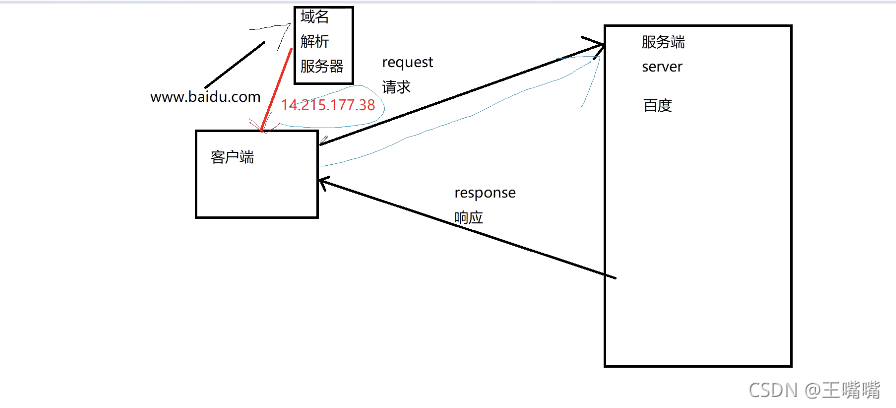 客户端请求服务端,输入www.baidu.com,想要访问百度,真正来讲它不是把请求发给百度服务器,而是去寻找域名解析服务器,去询问域名解析服务器,www.baidu.com这个域名所对应的IP地址是多少,域名解析服务器回应告诉客户端百度的IP地址是什么。