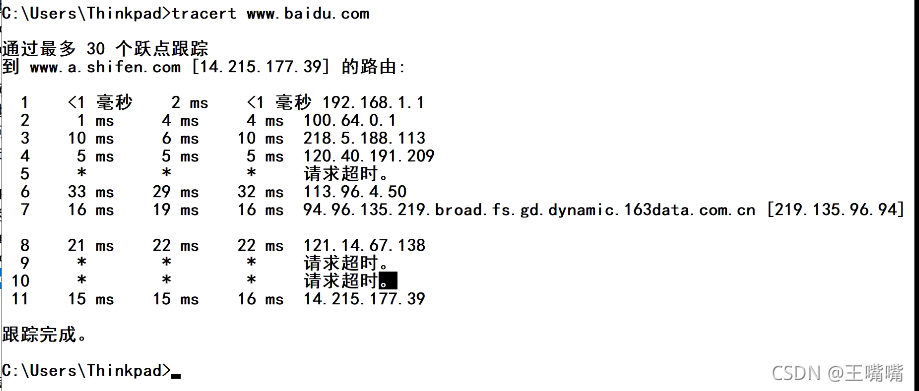最后得到了百度的IP地址——14.215.177.39,相当于tracert会给你展示到14.215.177.39的全过程。