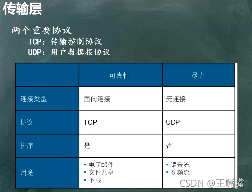 TCP:传输控制协议(涉及比较多) 可靠的协议,面向连接,一般是用于重要、比较大的数据传输