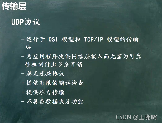 UDP:用户数据报协议 尽力而为,不可靠,无连接,不需要为可靠性付出多余的开销,所以传输速度比较快。一般用于语音、视频流量