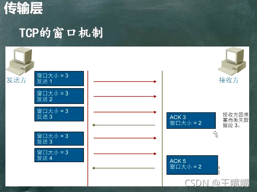 发送方先传三个数据,但接收方处理不过来,丢失了数据段3,发送了ACK3,告诉发送方一次发送两个数据就好,调整传输数据的快慢。