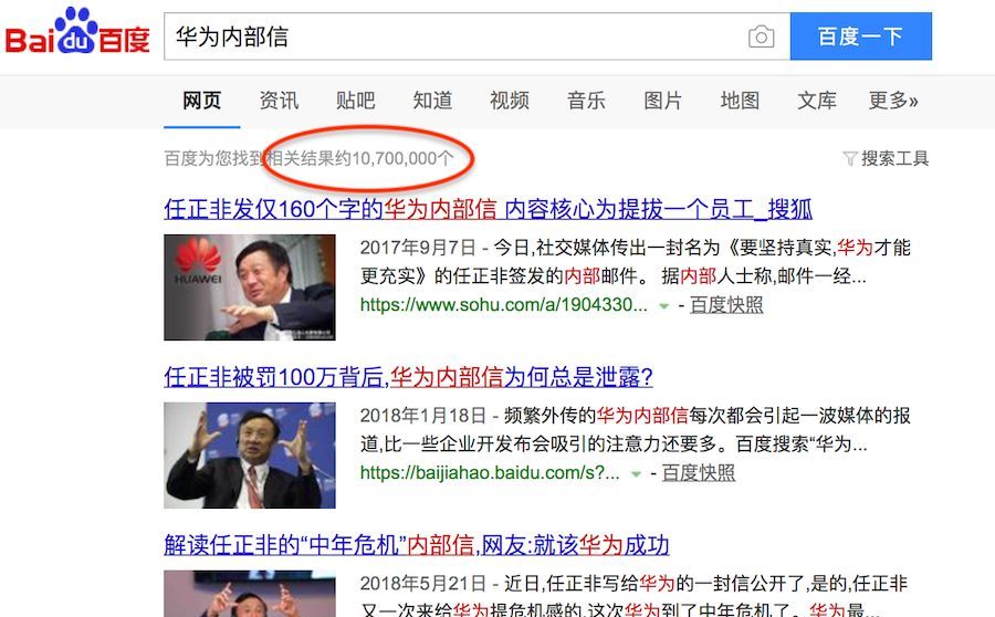 我们不妨搜素一下“华为内部信”,百度搜索框搜索显示1070万个搜索结果。