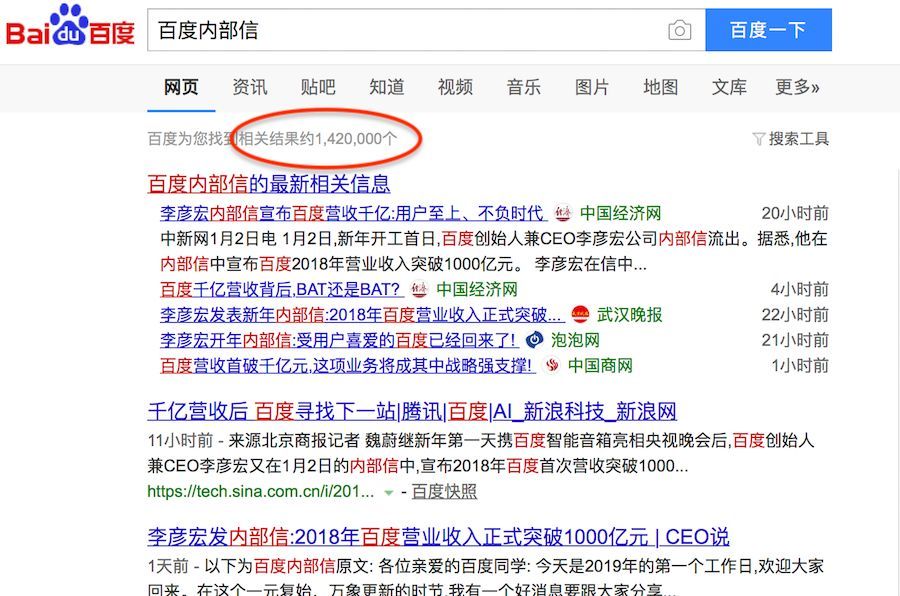然而我们搜索“百度内部信”,百度搜索框搜索显示只有142万个搜索结果。