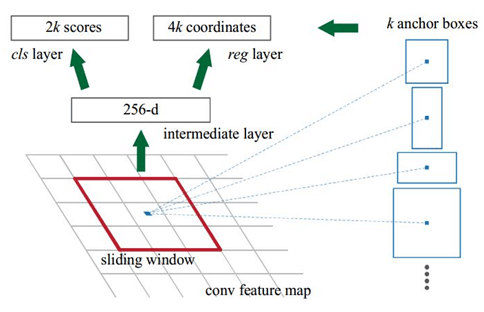 RPN的实现方式:在conv5-3的卷积feature map上用一个n*n的滑窗(论文中作者选用了n=3,即3*3的滑窗)生成一个长度为256(对应于ZF网络)或512(对应于VGG网络)维长度的全连接特征.然后在这个256维或512维的特征后产生两个分支的全连接层: