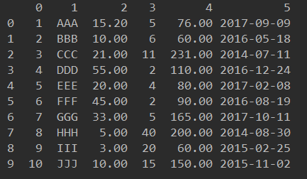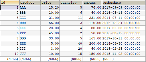 create table demo( id int ,product varchar(50) ,price decimal(18,2) ,quantity int ,amount decimal(18,2) ,orderdate datetime ); insert into demo select 1,'AAA',15.2,5,76,'2017-09-09' union all select 2,'BBB',10,6,60,'2016-05-18' union all select 3,'CCC',21,11,231,'2014-07-11' union all select 4,'DDD',55,2,110,'2016-12-24' union all select 5,'EEE',20,4,80,'2017-02-08' union all select 6,'FFF',45,2,90,'2016-08-19' union all select 7,'GGG',33,5,165,'2017-10-11' union all select 8,'HHH',5,40,200,'2014-08-30' union all select 9,'III',3,20,60,'2015-02-25' union all select 10,'JJJ',10,15,150,'2015-11-02';