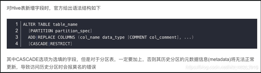 1.cascade的中文翻译为“级联”,也就是不仅变更新分区的表结构(metadata),同时也变更旧分区的表结构。