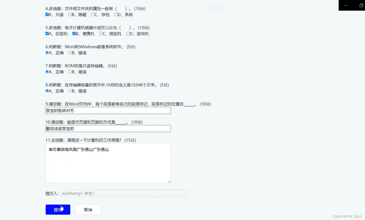 考试结束后,考生提交试卷后,客观题由系统自动打分,然后总成绩由客观题加主观题得分。