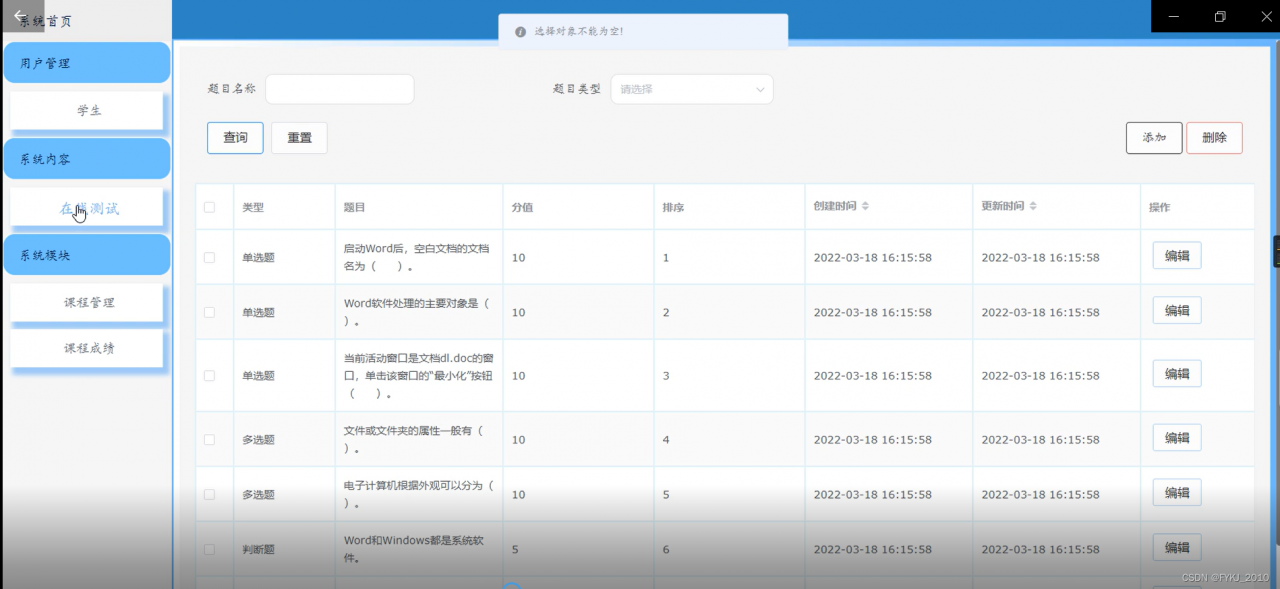 在线测试管理,在在线测试管理页面中可以查看索引、类型、题目、分值、排序等信息进行相对应操作,如图5-13所示。