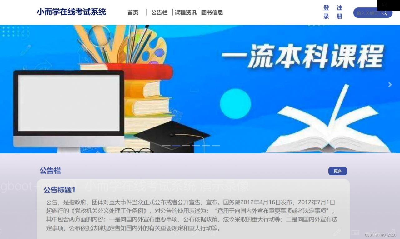 在线考试系统主要功能模块包括登录、管理员:首页、公共管理(轮播图、公告栏)用户管理(管理员、教师、学生)系统内容(课程资讯、资讯分类、在线测试)系统模块(图书分类、图书信息、课程管理、课程成绩)账号维护,采取面对对象的开发模式进行软件的开发和硬体的架设,能很好的满足实际使用的需求,完善了对应的软体架设以及程序编码的工作,采取MySQL作为后台数据的主要存储单元,采用java技术、Ajax技术进行业务系统的编码及其开发,实现了本系统的全部功能。本次报告,首先分析了研究的背景、作用、意义,为研究工作的合理性打下了基础。针对在线考试系统的各项需求以及技术问题进行分析,证明了系统的必要性和技术可行性,然后对设计系统需要使用的技术软件以及设计思想做了基本的介绍,最后来实现在线考试系统和部署运行使用它。