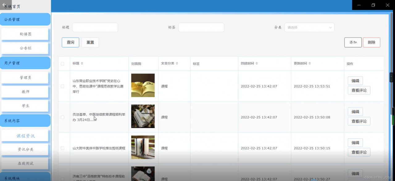课程资讯管理,在课程资讯管理页面中可以查看索引、标题、封面图、文章分类、标签等信息,并可根据需要进行修改或删除等操作,如图5-8所示。