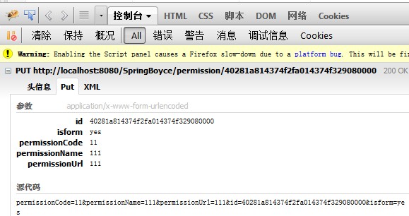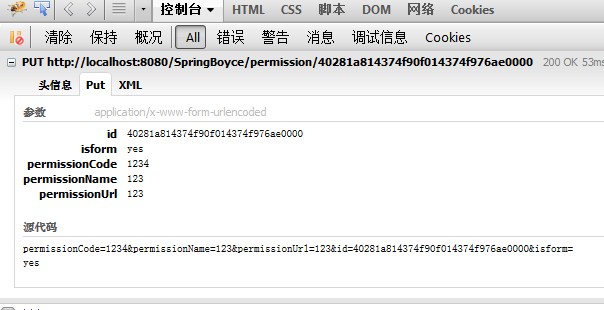 </form>下边我们来看下,运行的结果,我会在我的前台发起一个PUT请求作为案例,