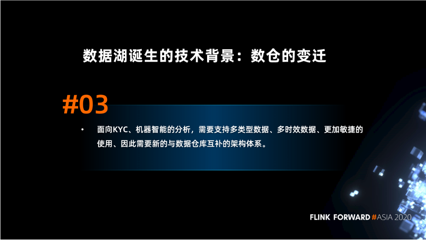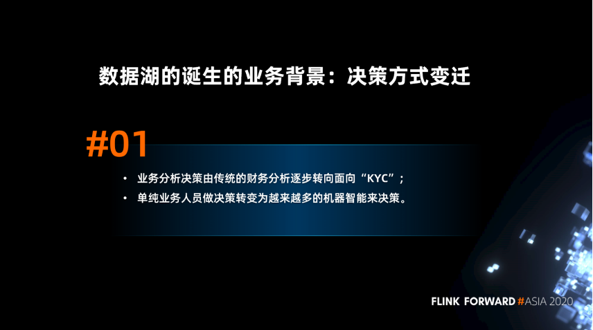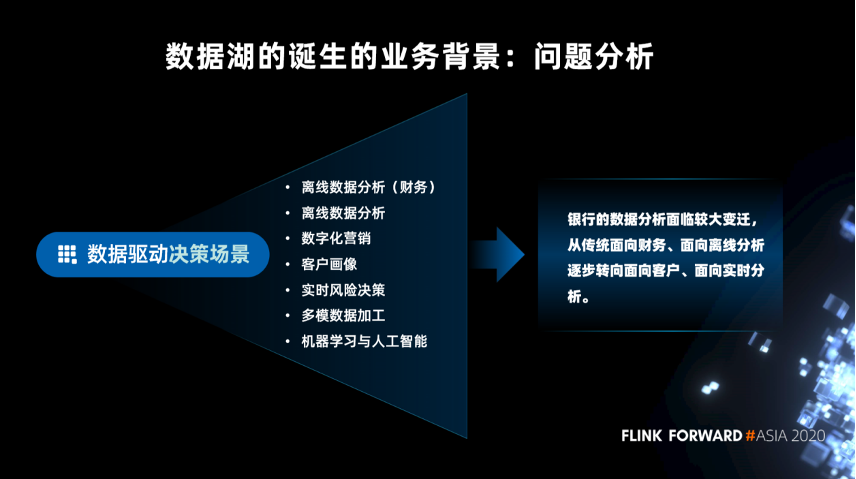 如此多的技术,加上数据驱动决策的场景,决定了当前银行的数据分析面临着一个巨大的变迁,从传统的面向财务的、面向离线的数据分析,逐步转向面向客户的、面向实时的数据分析。以上是实时金融数据湖建设的第一个观点。