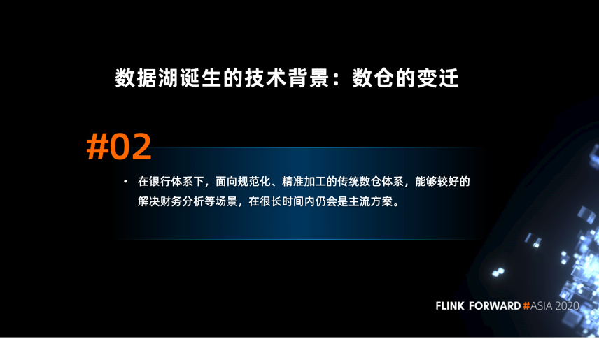 实时金融数据湖建设的第二个观点是,在银行体系下,面向规范化、精准加工的传统数仓体系,能够较好的解决财务分析等场景,并在很长时间内仍会是主流方案。