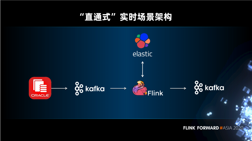 上面主要介绍了流计算开发平台的架构和优势,下面针对具体的场景做进一步介绍。首先是“直通式”实时场景架构。