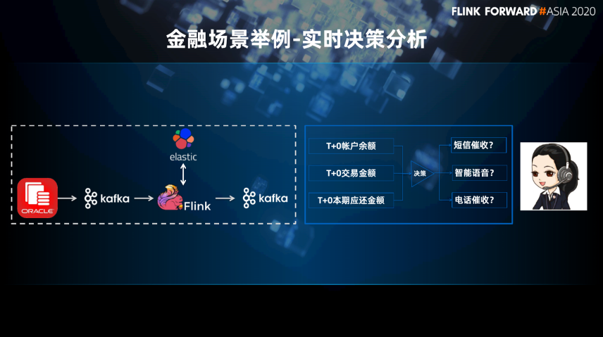 如果是基于原有的离线数仓的架构,得到的数据都是 T+1 的。用过期的数据决策,可能客户已经还款,但是仍然存在电话催收的问题。而通过“直通式”场景架构的应用,可以实现 T+0 的账户余额,交易金额和本期应还金额,实时进行决策,提升用户的体验。