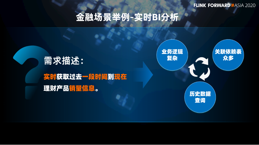 再来看一个例子,实时获取过去一段时间到现在的理财产品销量信息,这个需求有一些关键字,需要“实时获取”,即需要 T+0 的数据。“一段时间到现在”,它涉及历史数据的查询。理财产品的销量信息涉及到银行业务,一般都比较复杂,需要用到多流 join。