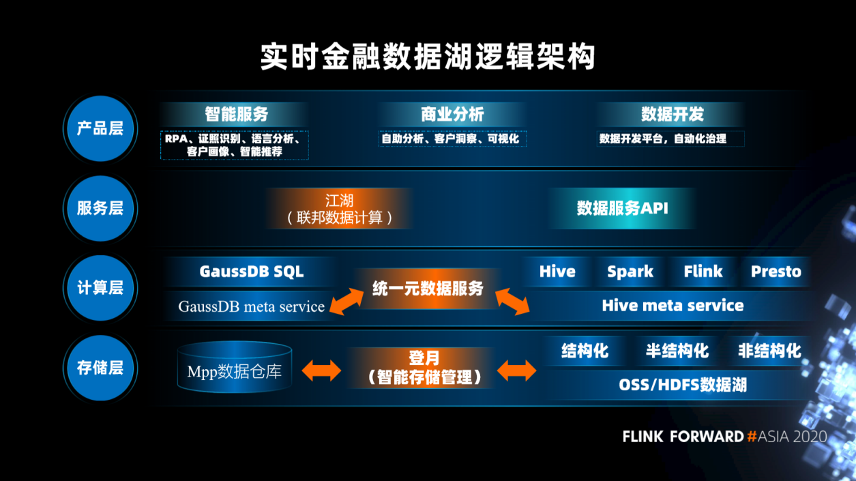 实时金融数据湖的逻辑架构主要有 4 层,包括存储层、计算层、服务层和产品层。