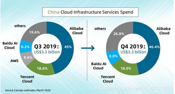 2019年第四季度,中国云计算市场规模达33亿美元,持续保持高速增长。相比上一季度,市场领头羊份额进一步扩大。