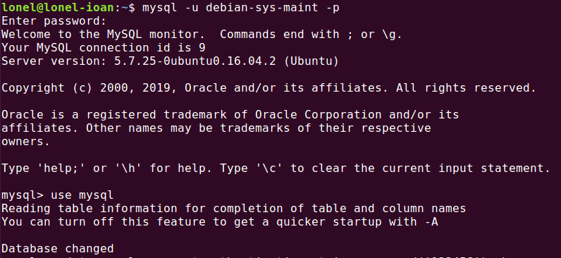 2、使用账号 debian-sys-maint 账号登录mysql密码为 debian.cnf 中password 值(# password 值每个人的情况不一样,根据实际情况),在切换到mysql
