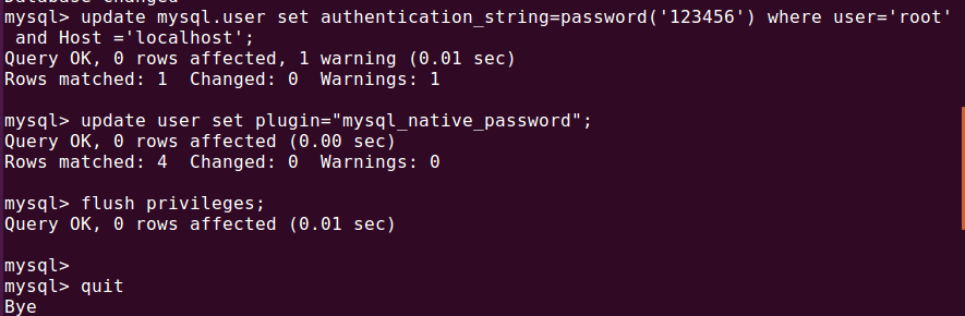 update mysql.user set authentication_string=password('123456') where user='root' and Host='localhost';