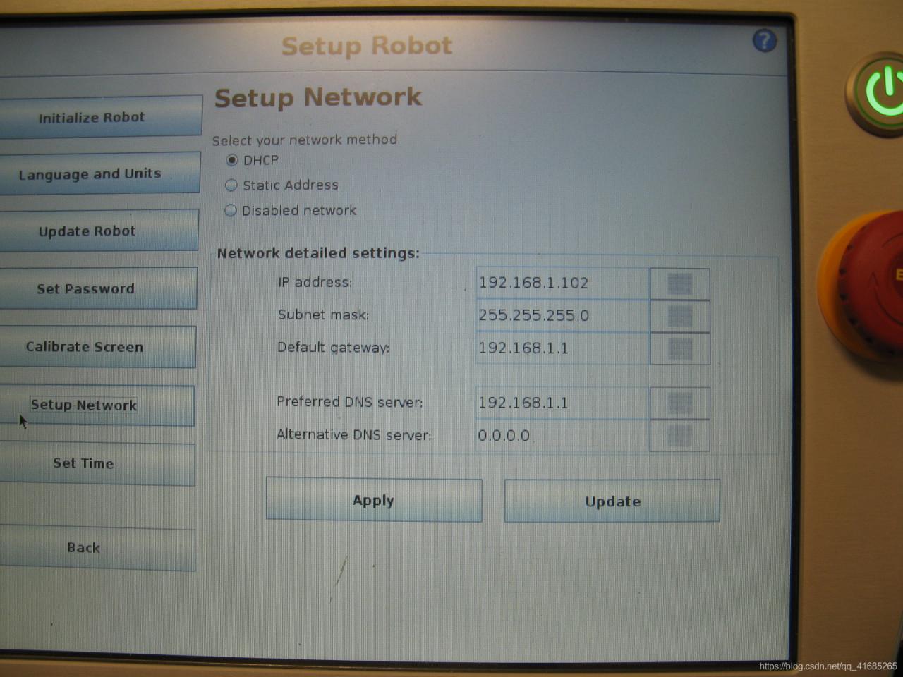 下一步是确保正确配置您的硬件(控制计算机和机器人)以相互通信。 请注意,默认情况下,Universal Robot的网络功能处于禁用状态。 要启用网络连接,请使用UR的示教器导航至设置机器人->设置网络菜单(如下附件所示)。