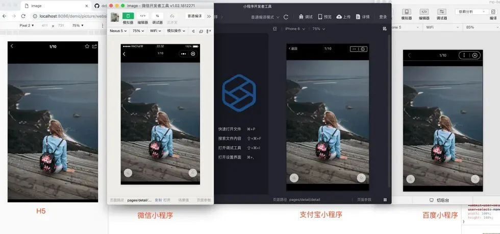 接着运行uni-app示例项目,选择官方账号下的看图App模板测试,运行到各端后效果: