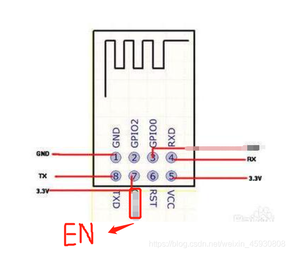 这里我们看到该模块有8个接口,但是实际上我们只需要用到五个接口就可以操作这个WiFi模块了,主要是3.3V、GND、RXD、TXD、EN这五个接口可以看上图,RXD接单片机上的TXD接口(这里我用的是串口3,所以接PB10),TXD接单片机上的RXD接口(即PB11),EN接3.3V即可。