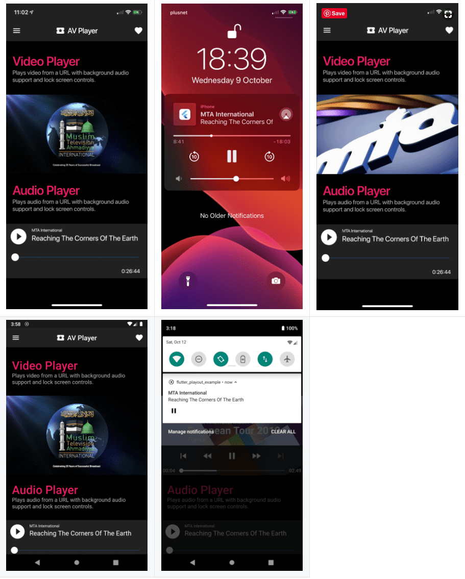 Audio & Video player in Flutter. This plugin provides audio/video playback with background audio support and lock screen controls for both iOS & Android. Also provides player events such as onPlay, onPause, onTime etc.
