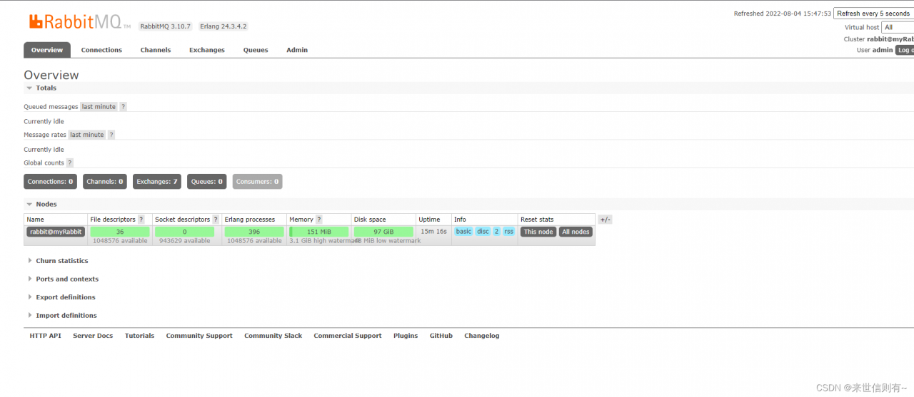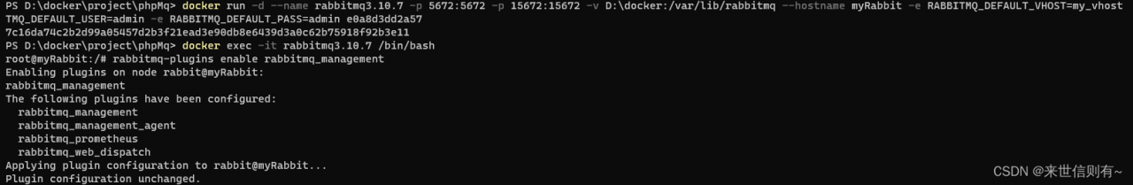 docker run -d --name rabbitmq3.10.7 -p 5672:5672 -p 15672:15672 -v D:\docker:/var/lib/rabbitmq --hostname myRabbit -e RABBITMQ_DEFAULT_VHOST=my_vhost -e RABBITMQ_DEFAULT_USER=admin -e RABBITMQ_DEFAULT_PASS=admin e0a8d3dd2a57-e 指定环境变量: