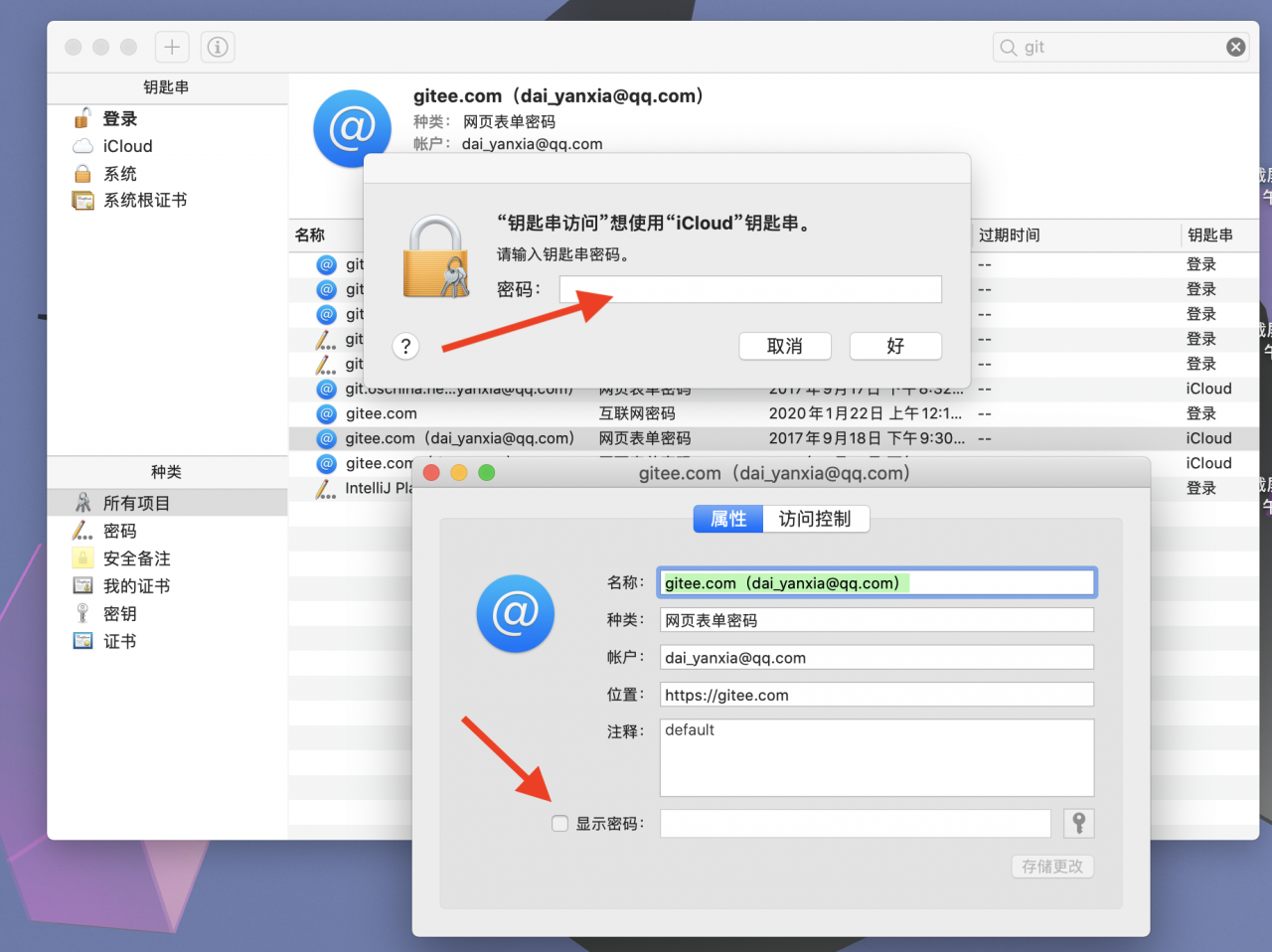 4.或者,点进去当前项目的git网址,点击〈显示密码〉会弹出让输入钥匙串密码的弹框,输入电脑开机密码即可: