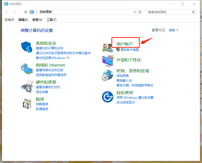 2.点击控制面板的〈用户账户〉