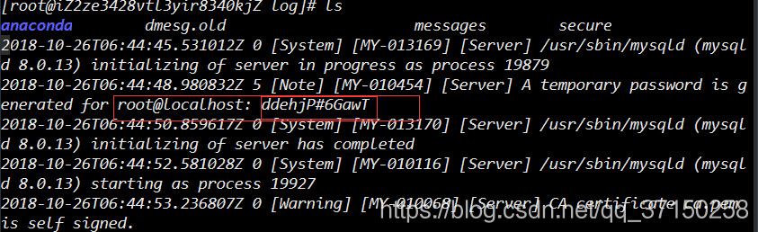 执行命令: vi /var/log/mysqld.log 查看该文件,其中红框处即为临时密码,可用于初次登录 数据库