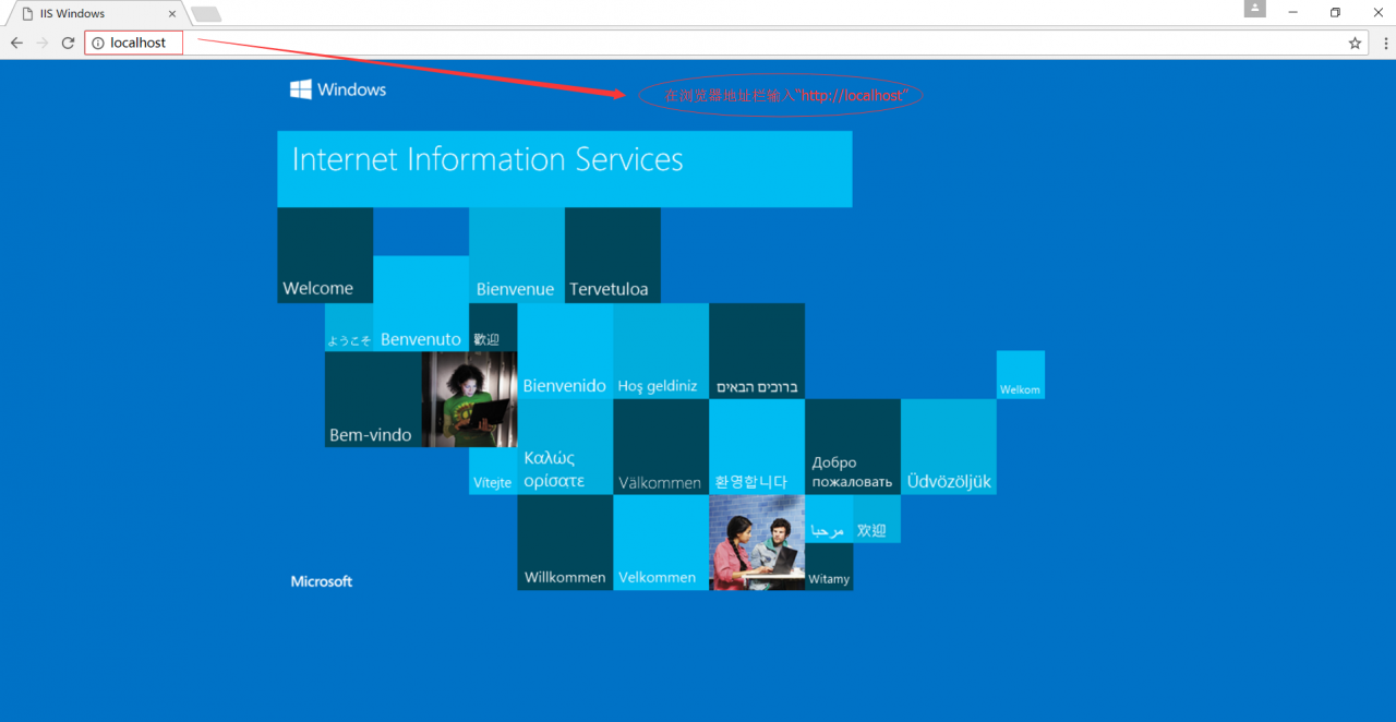 6、重启电脑后,测试IIS配置是否成功。在浏览器栏,输入“http://localhost”,若出现如下界面,则表示IIS安装成功。