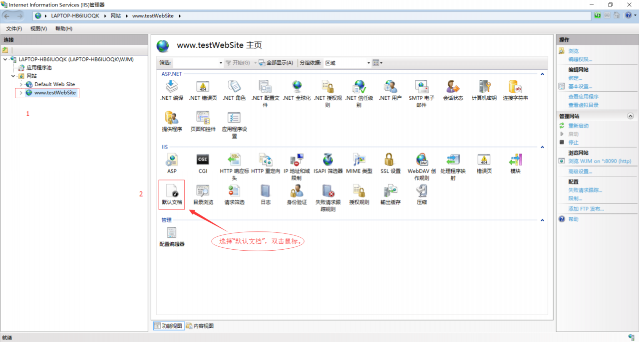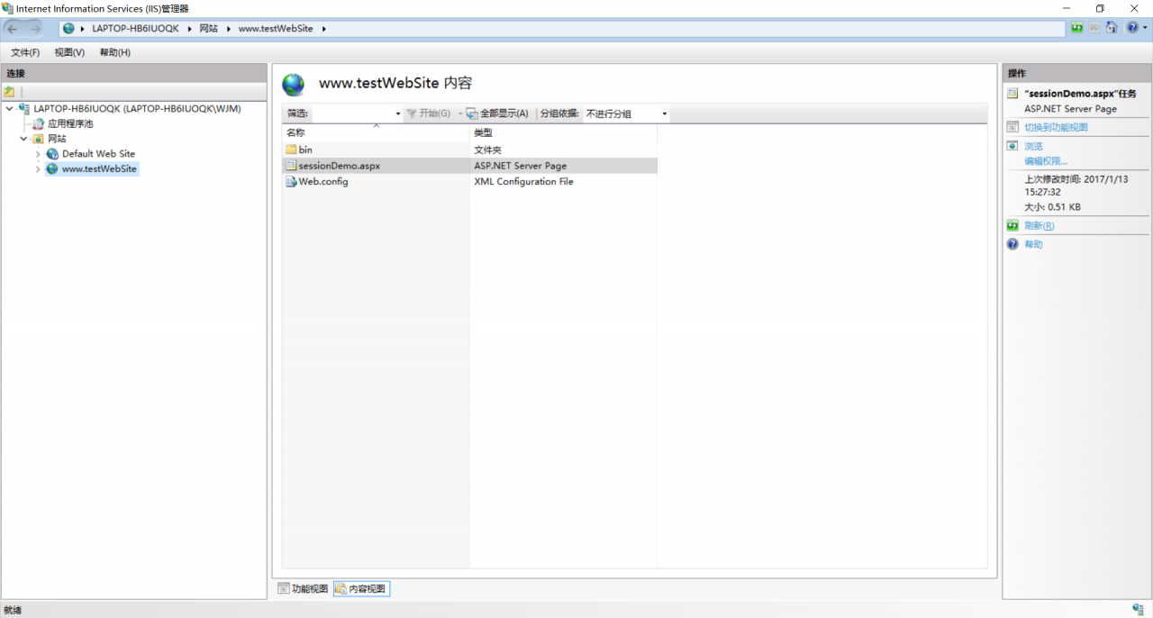5、此时,IIS主界面,“网站”多了一个站点“www.testWebSite”,即是刚才给站点取得名字。