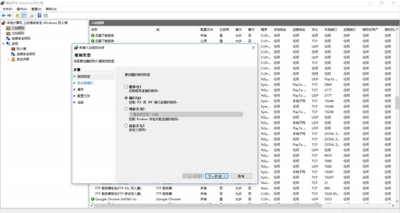 的窗口依次选择:选中端口—>下一步—>选中TCP以及特定本地端口填入要开放的端口号(这里填入80;当让也可以选择开放所有端口