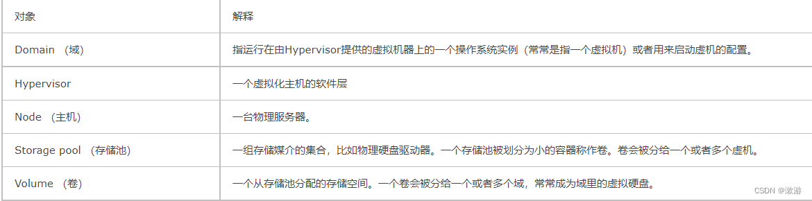 - 它使用 XML 来定义各种虚拟机相关的受管理对象。