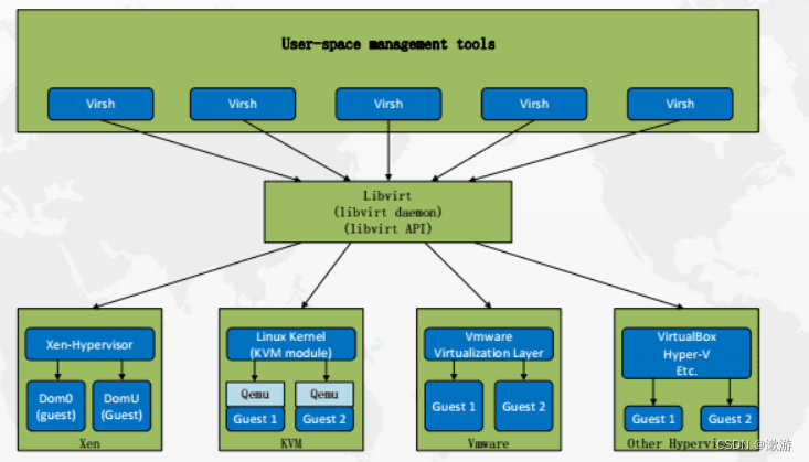 - 它作为中间适配层,让底层 Hypervisor 对上层用户空间的管理工具是可以做到完全透明的,因为 libvirt 屏蔽了底层各种 Hypervisor 的细节,为上层管理工具提供了一个统一的、较稳定的接口(API)。