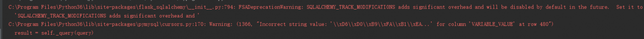 from flask import Flask from flask_sqlalchemy import SQLAlchemy app = Flask(__name__) SQLALCHEMY_DATABASE_URI = 'mysql+pymysql://root:Apassword@localhost:3306/test' app.config['SQLALCHEMY_DATABASE_URI'] = SQLALCHEMY_DATABASE_URI db = SQLAlchemy(app) class Test(db.Model): __tablename__ = 'test' id = db.Column(db.INTEGER, primary_key=True) name = db.Column(db.String(255), nullable=False) def __repr__(self): return '<Test %r>' % self.name def quick_update(): li = [] for i in range(100): li.append(Test(name='test_%s' % i)) db.session.add_all(li) db.session.commit() if __name__ == '__main__': quick_update()执行函数出现警告,未影响数据插入(未解决)