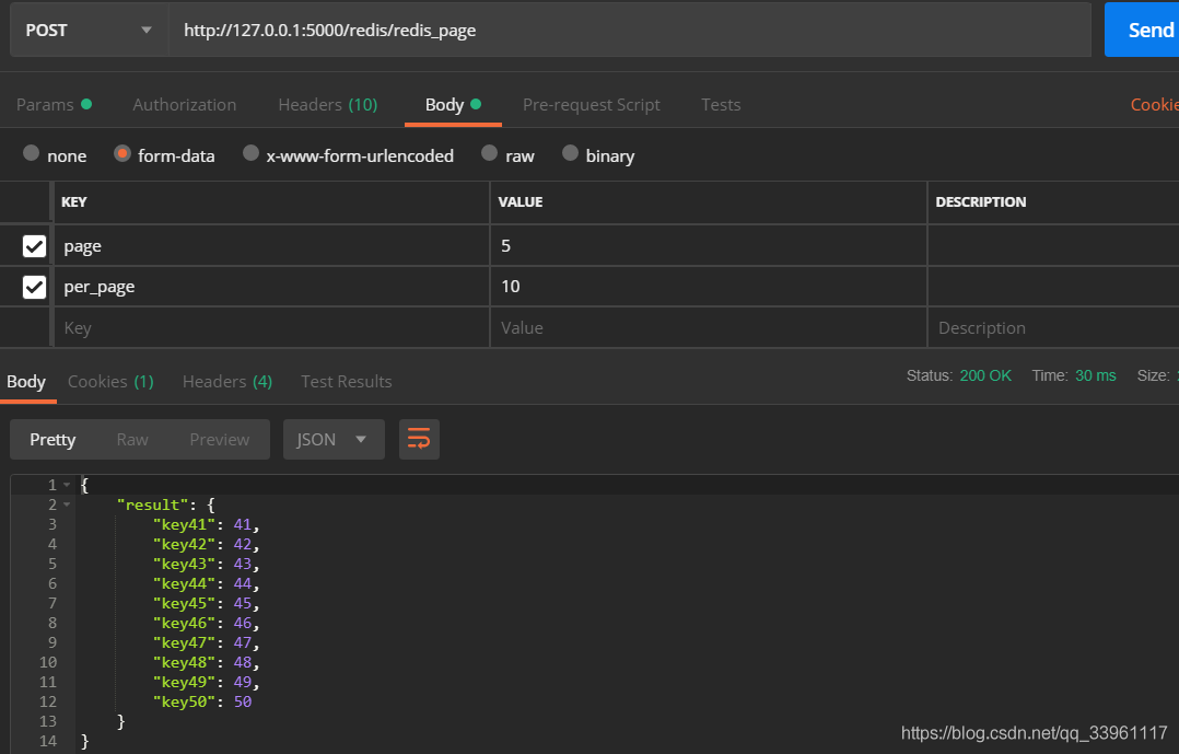 # 视图函数 from flask import Blueprint, request, jsonify from flask_restful import Resource from extensions import redis_store0 from . import Api redis_page_blueprint = Blueprint('redis_page', __name__) redis_page_api = Api(redis_page_blueprint) class RedisPage(Resource): def post(self): # page 当前页码(比如当前页是第5页,返回5) page = int(request.form['page']) # per_page 每页显示的记录条数量 per_page = int(request.form['per_page']) print(page, per_page) # zrangebylex(name, min, max, start=None, num=None) 从有序集合中获取实时数据列表,根据index排序获取 # redis_keys = redis_store0.zrangebylex('test', "-", "+", start=(page - 1) * per_page + 1, num=per_page) # zrangebyscore(self, name, min, max, start=None, num=None, withscores=False, score_cast_func=float) 根据score排序 count = redis_store0.zcard('test') redis_keys = redis_store0.zrangebyscore('test', 0, count, start=(page - 1) * per_page + 1, num=per_page) print(redis_keys) res_dic = {k: redis_store0.zscore('test', k) for k in redis_keys} return jsonify({'result': res_dic}) redis_page_api.add_resource(RedisPage, '/redis_page') # http://127.0.0.1:5000/redis/redis_page
