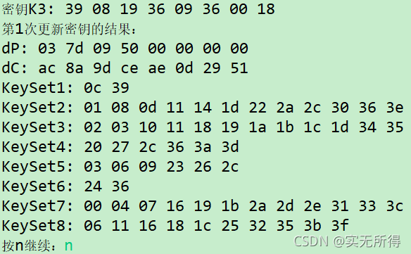 本次测试要计算的密钥K3值为0x39,0x08,0x19,0x36,0x09, 0x36,0x00,0x18,可以看到,经过3次对密钥集合进行更新,即可唯一确定最终的密钥K3。