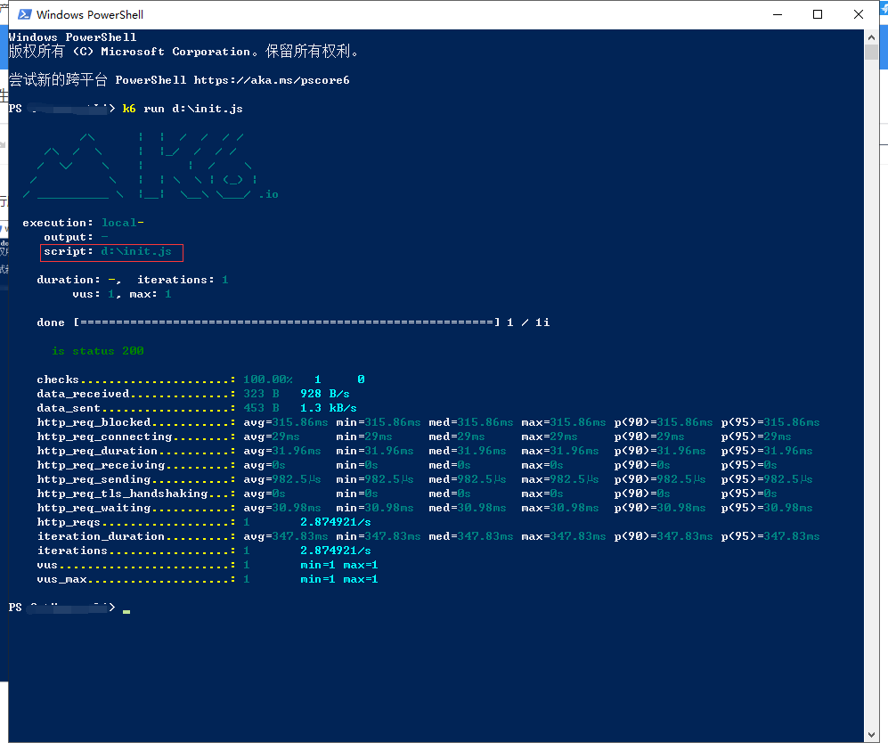 执行脚本的只需要在输入:k6 run +脚本名。如下图: