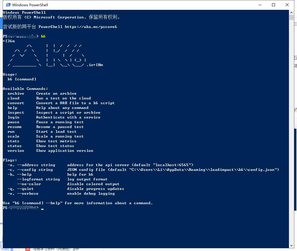 以window系统为例,到官网下载最新版本,根据安装提示默认安装即可。安装完成后在命令窗口输入:K6,检测是否安装成功。出现如下图就是成功了:
