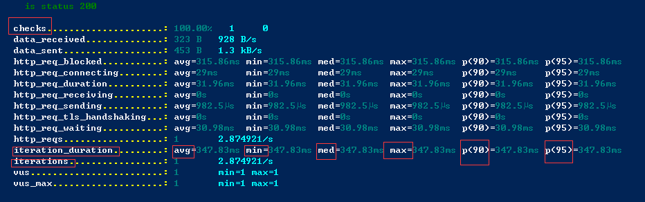 其中iteration_duration中,我们可以看到平均消耗时间,最大最小,以及百分之90请求所用时间等,这点与jmeter相识。
