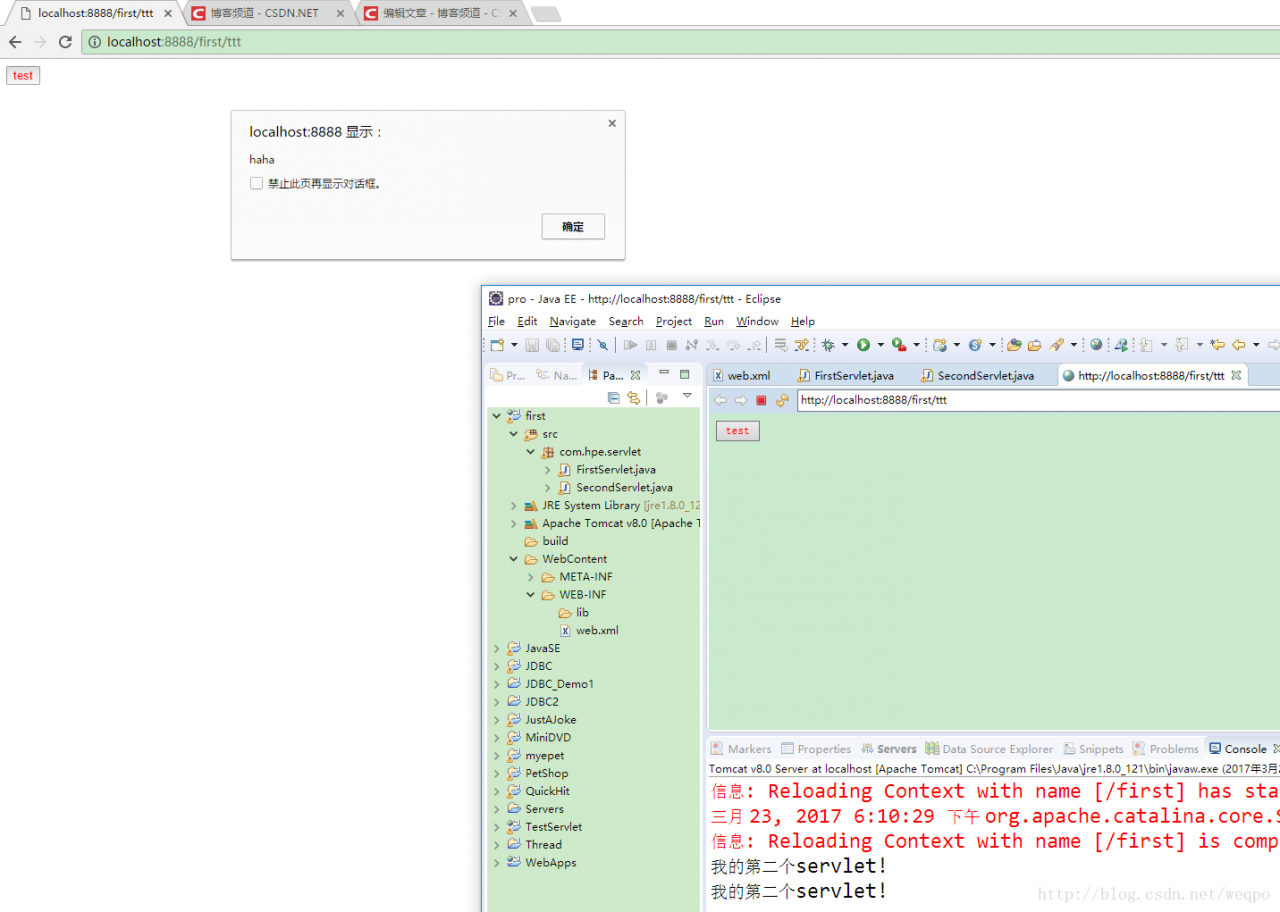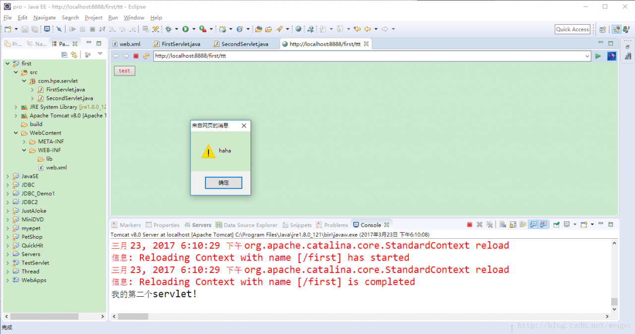 等待服务器重写加载完成,手动运行SecondServlet.java,点击test按钮后,显示效果如下: