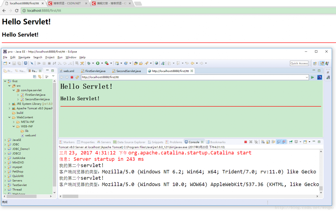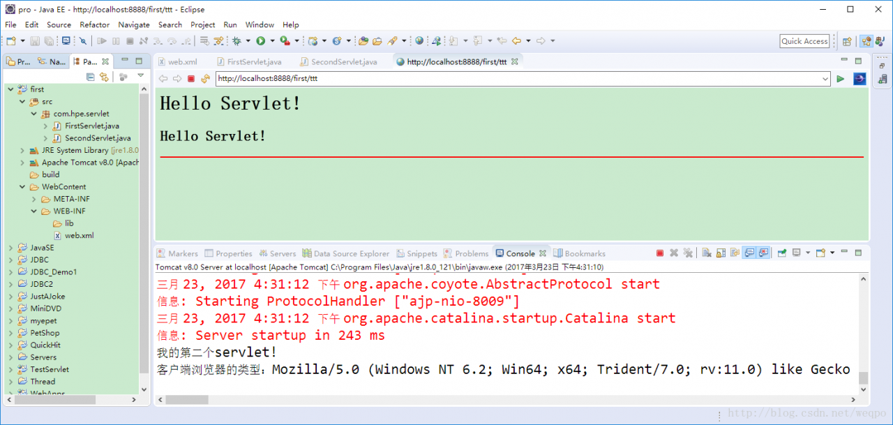 </servlet-mapping>启动Tomcat服务器,手动运行SecondServlet.java,显示效果如下: