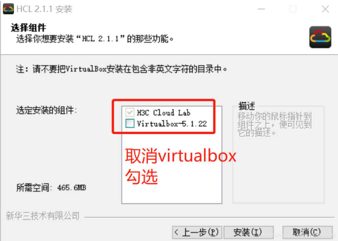 安装 HCL_V2.1.1_Setup.exe 过程中会提示安装virtualbox,由于模拟器不能用该版本的virtualbox启动交换机等,所以选择不安装;