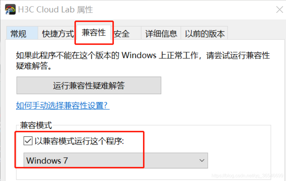 在h3c cloud lab 图标上, 右键-->属性-->兼容性-->选择以windows 7 兼容模式运行程序-->点击右下角 应用,确定